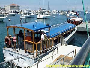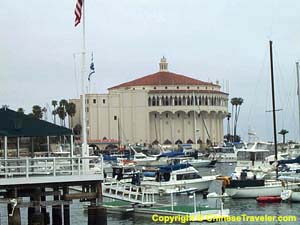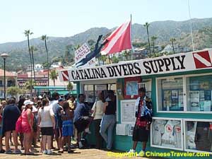 Station〉到長堤市〈Long Beach〉的轉運站〈Transit Mall〉,再轉搭乘免費的 Long Beach Downtown Runabout (Route C) 到達瑪莉皇后號〈Queen Mary〉及旁邊的 Catalina Express 港。Route C從早上5:30開始營業到半夜,七天營業。 海路的交通有: 1. Catalina Express 從 Long Beach 或 San Pedro 出發 電話 (310) 519-1212 或 (800) 360-1212 2. Catalina Cruises 從 Long Beach 出發 電話 (800) 228-2546 3. Catalina Passenger Service 從 Newport Bay 出發 電話 (949) 673-5245 空中交通有: 1. Catalina-Vegas Airlines 從聖地牙哥大約四十分鐘的飛行時間 電話 (619) 292-7311 2. Island Express 的直昇機服務從 Long Beach 或 San Pedro 出發大約 15 到 20 分鐘的航程 電話 (310) 510-2525 卡達琳納島有美麗的海灘、網球場,在島上也可以騎馬、爬山、浮潛、露營、和釣魚。在島上都可以租到器材及用具。為了要保護島上脆弱的生態環境,所以不能在島上開車,島上可以租到高爾夫球車和腳踏車,如果要騎腳踏車到島內深處探險的話,一定要記得到卡達琳納島管理委員會 (310) 510-2595 申請通行證,公車和行人則不必申請。  Catalina 島上的聚會廳〈Casino〉 |  Catalina 島上的潛水設備出租 |