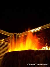 海市蜃樓〈The Mirage〉 每天晚上賭場前門的噴泉搖身一變而成為一場火山爆發秀,每十五分鐘一次。 Bellagio 另一個海市蜃樓〈The Mirage〉公司的創作,位於Bellagio 前方的人工湖每十五分鐘展出古典的水舞,並有非常多種的音樂配合。在看完賭場外的水舞後,一定要參觀 Bellagio 的內部裝潢,這間大概是拉斯維加斯最古典的賭場旅館內靠近服務台後方還有一個美麗的植物園 ,這裡有非常壯觀的花景,這裡的花每季都會更換以反映季節的變化!這裡還有藝術畫廊〈Gallery of Fine Art〉,讓你有機會看一些世界上最專屬的藝術品。